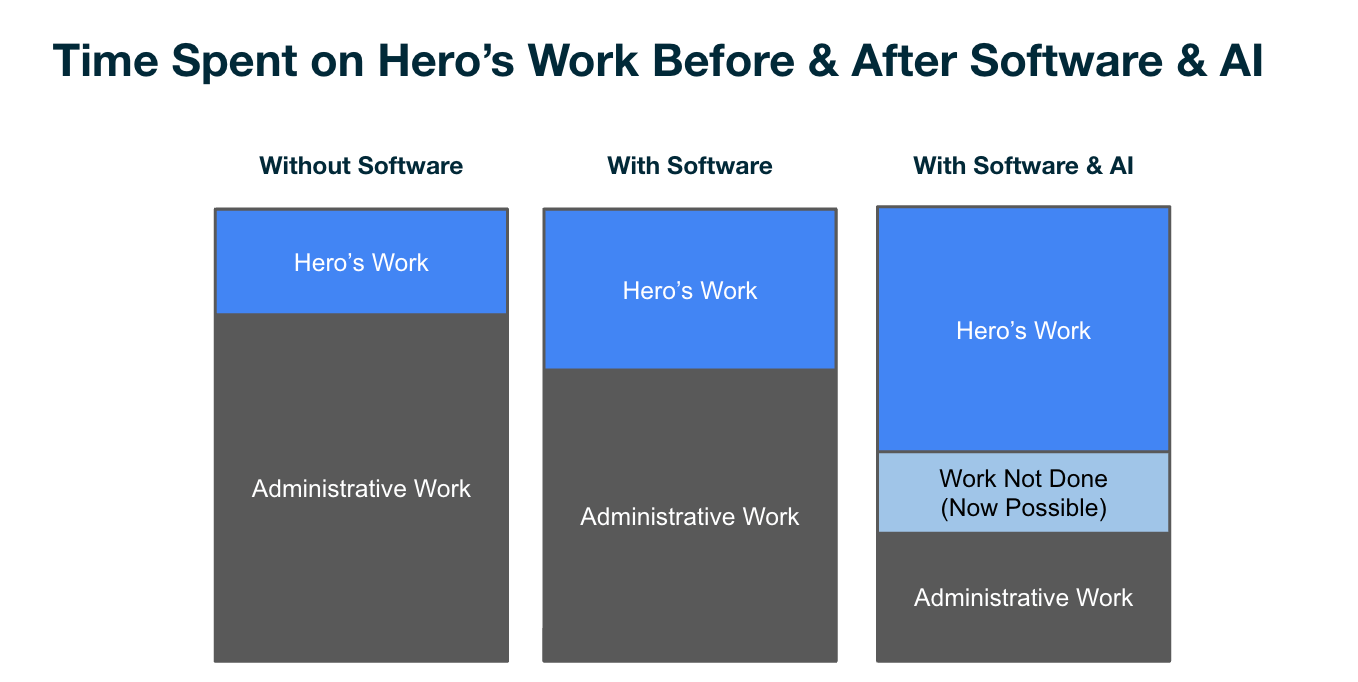 Great software empowers the Hero's Work, automates and eliminates Administrative Work, and makes the "Work Not Done" suddenly feasible. The key is to focus on what your users love doing and design AI to enhance it.
