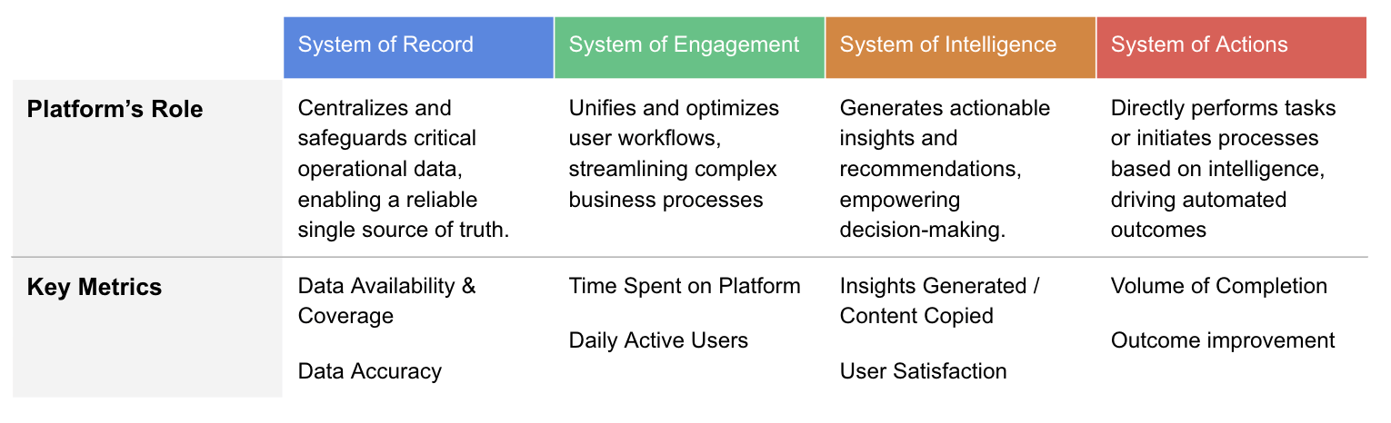 The evolution of software demands a new lens for evaluating success. As platforms transition from Systems of Record to Systems of Intelligence and Actions, the key metrics shift dramatically: