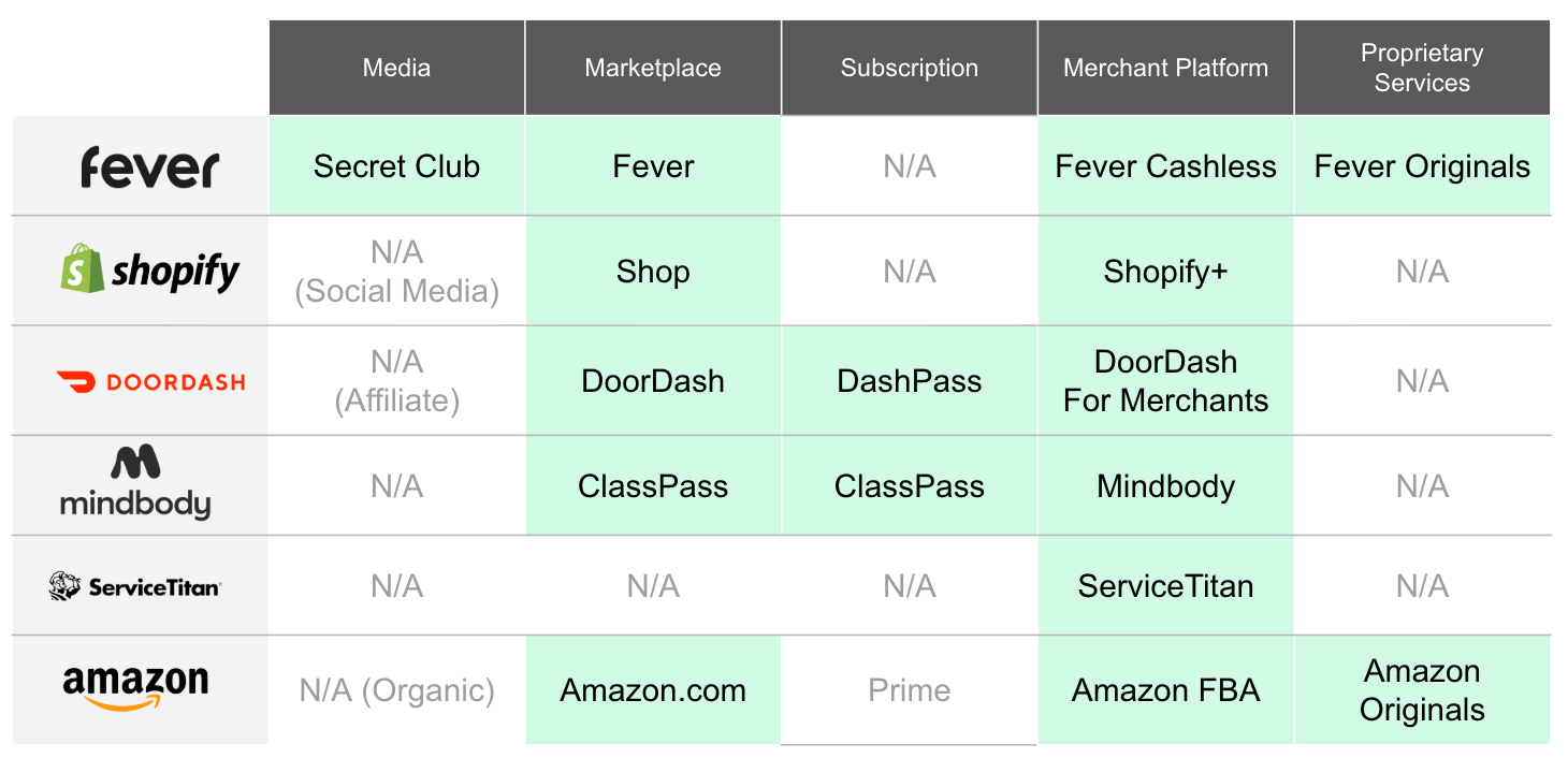 When compared to leading vertical platforms such as Shopify, DoorDash, Mindbody, ServiceTitan, and Amazon, Fever shares many of the same foundational ingredients, with the ambition to cover the full merchant stack while simultaneously building a powerful consumer brand.