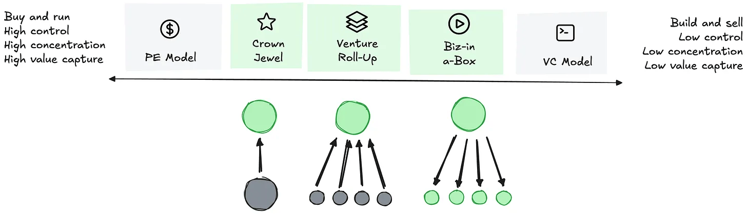 Franchises sit at the other end of the spectrum. They rely far less on software, instead leaning on financial engineering and brand equity to grow. By acquiring or licensing a brand, a franchise can expand to dozens of local operators, with higher value capture per business than SaaS or BIAB. However, exposure is limited: franchises usually scale to dozens, not thousands, of locations. Their power lies in unit economics and centralized control, rather than innovation in software.