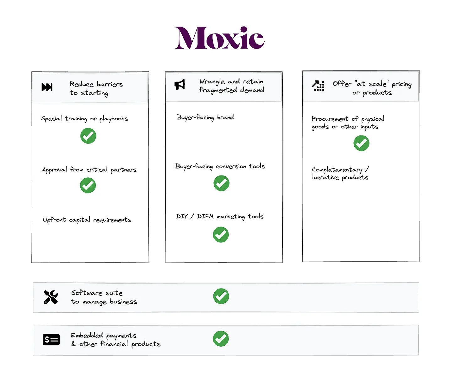 Moxie blends traditional SaaS businesses and the franchising model. It uses software and network scale to reshape how entrepreneurs enter and succeed within a vertical