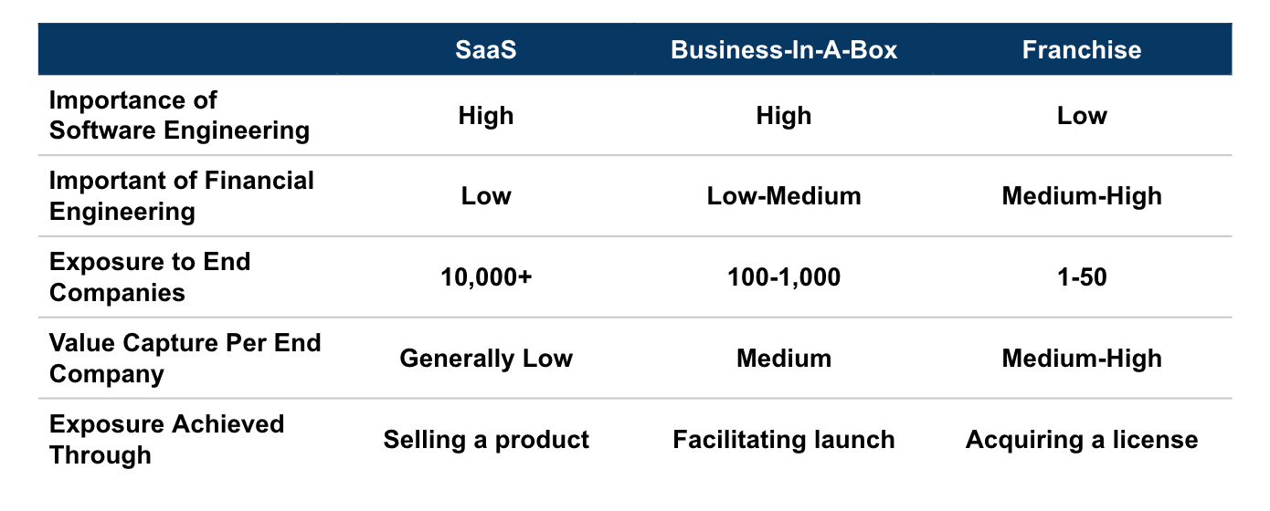 Business-in-a-Box (BIAB) models, like Moxie, represent a middle ground. They maintain a high reliance on software engineering, but combine it with services that facilitate the launch of entirely new businesses. Instead of selling to 10,000 customers, BIAB platforms typically support 100–1,000 entrepreneurs in a vertical, but capture more value per business because they are embedded in the core operations — from supply chains to revenue share. Financial engineering matters somewhat more than SaaS, given the importance of negotiating supply contracts and structuring revenue-sharing agreements, but the primary moat remains operational and software-driven.