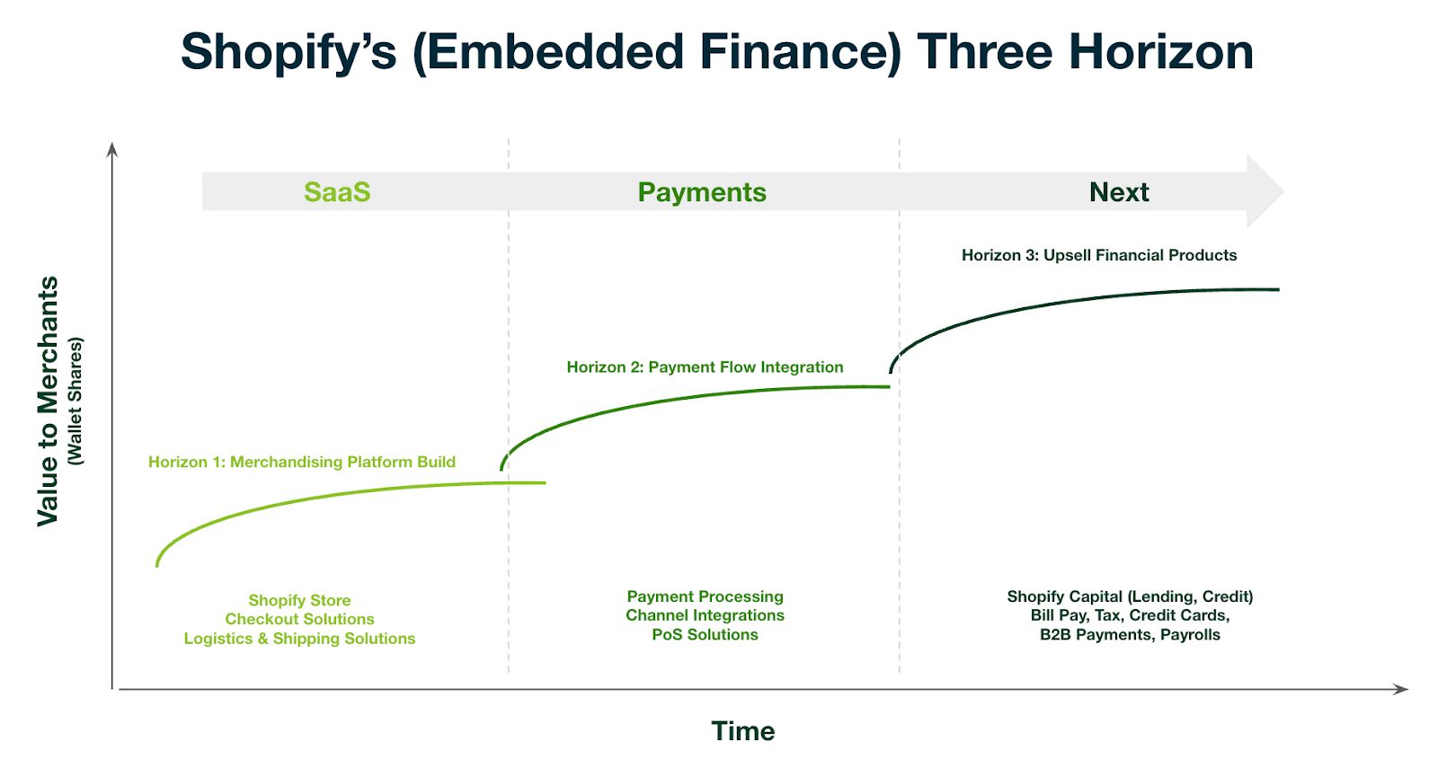 If you are building vertical SaaS for business owners in various industries. There are many useful lessons to be learned from the Shopify embedded finance approach. At a high level, Shopify can be described in these three horizons