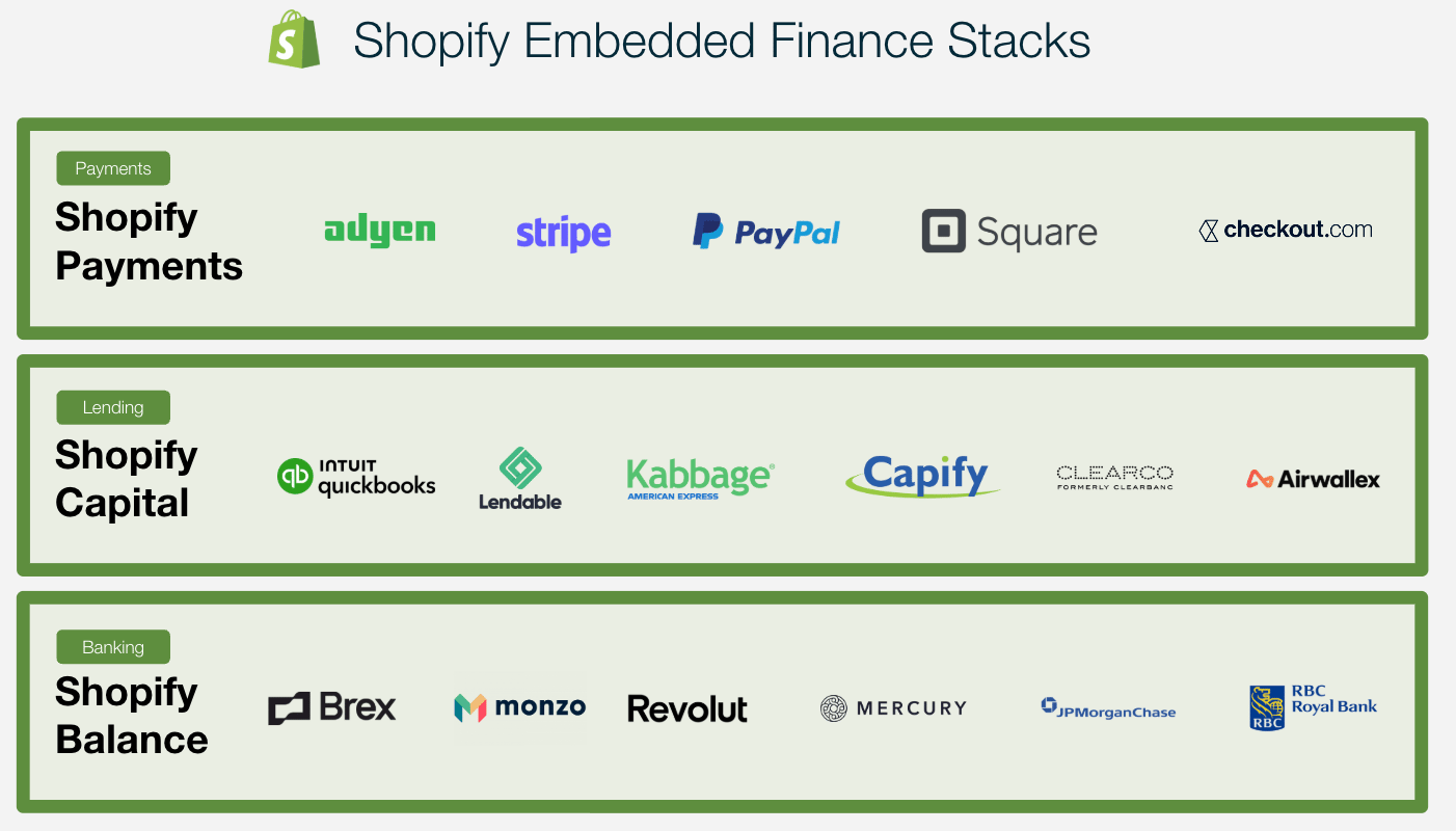 Shopify is the prime example of this model. It has evolved from a pure commerce platform into a vertically integrated fintech ecosystem, including its payment processing stack (Shopify Payments), its working capital arm (Shopify Capital), and its merchant account infrastructure (Shopify Balance).