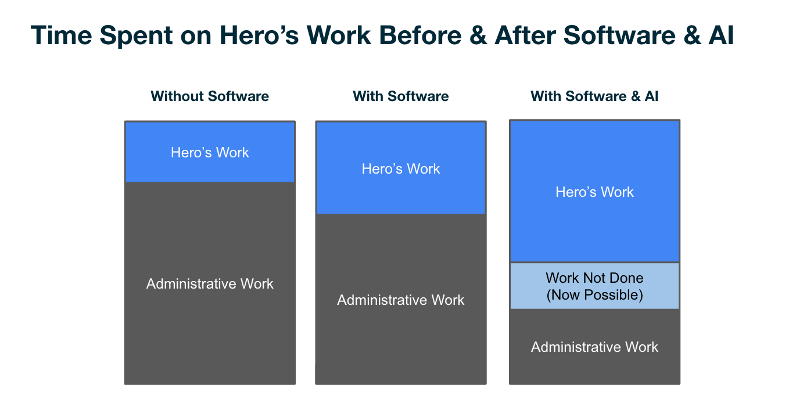 Great software empowers the hero’s work, automates/eliminates the administrative work, and makes the “work not done” suddenly feasible.